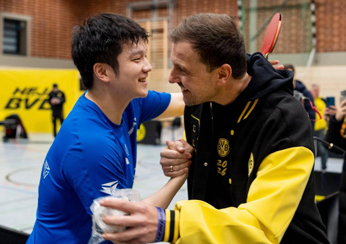 2026年1月13日,乒乓球德甲联赛展开了一场激烈的五盘大战。国乒奥运冠军樊振东代表萨尔布吕肯俱乐部出战。他在比赛中发挥出色,毫无悬念地零封多特蒙德队的两名选手,其中包括实力强劲的瑞典世界冠军卡尔森。然而,遗憾的是,他的队友状态低迷,连续输了三场比赛,最终导致整个团队失利。尽管如此,赛后樊振东与已经退役的德国前世界冠军波尔亲切握手、相拥庆祝,现场气氛其乐融融,令人感受到运动员间的深厚友谊。